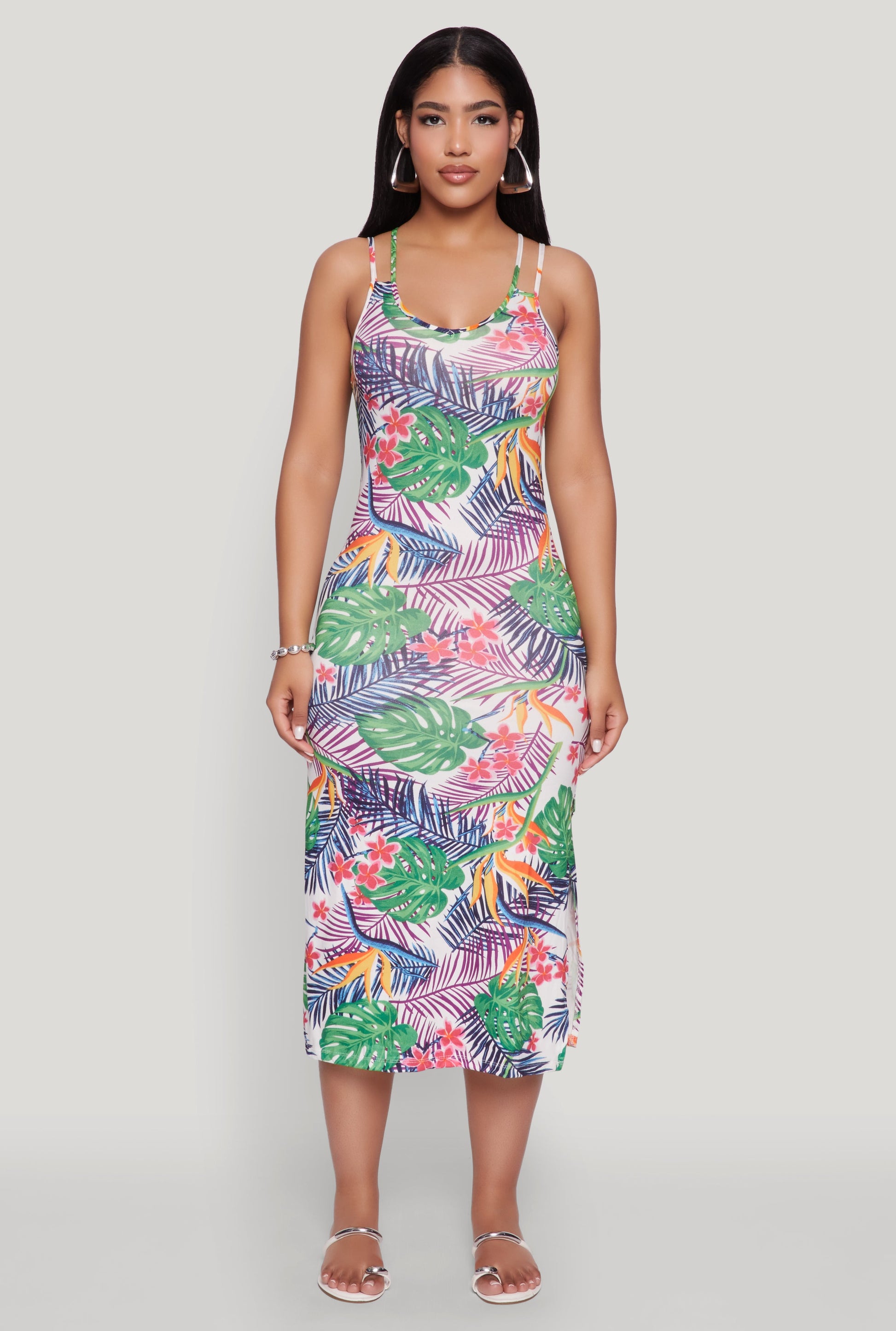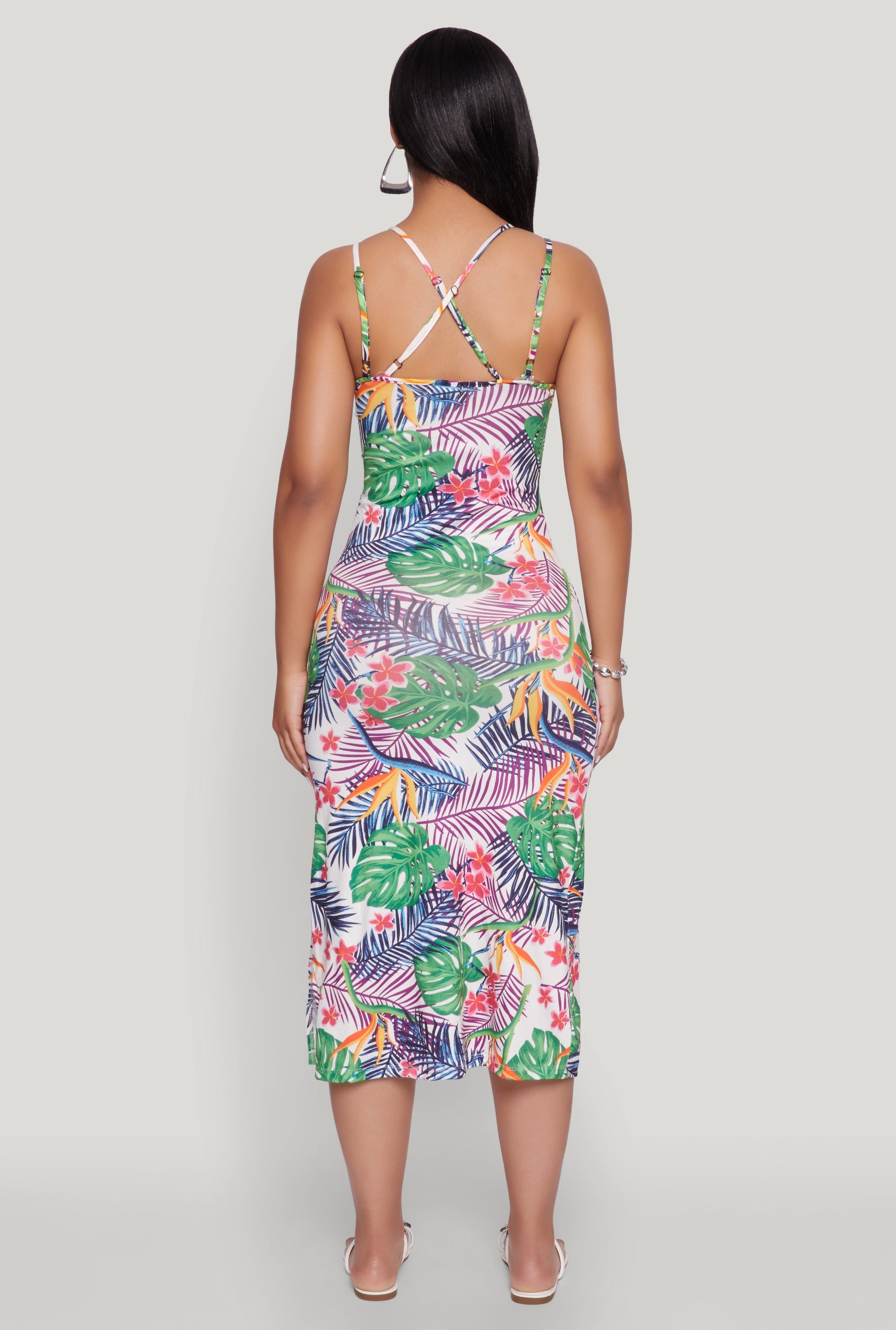 Step into sunshine and good vibes with our Tropical Print Double Strap Cami Dress. Perfect for those laid-back days, this long-length dress features a breezy sleeveless design and a flattering scoop neckline. The classic fit and timeless silhouette make it a versatile choice for any casual outing, while the crisscross back adds a touch of playful charm. Whether you're heading to brunch or a weekend getaway, this dress is your new go-to for effortless style and comfort.