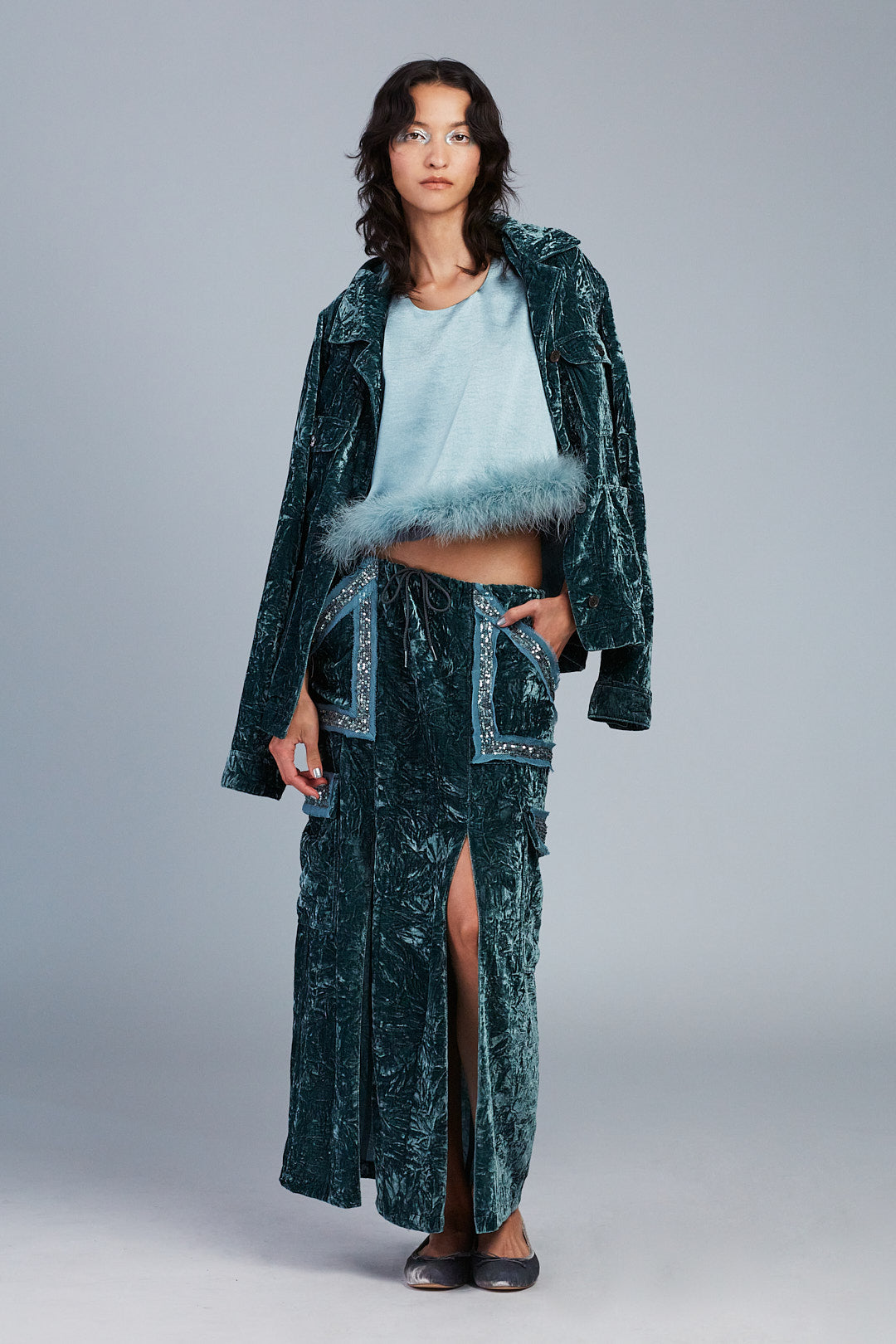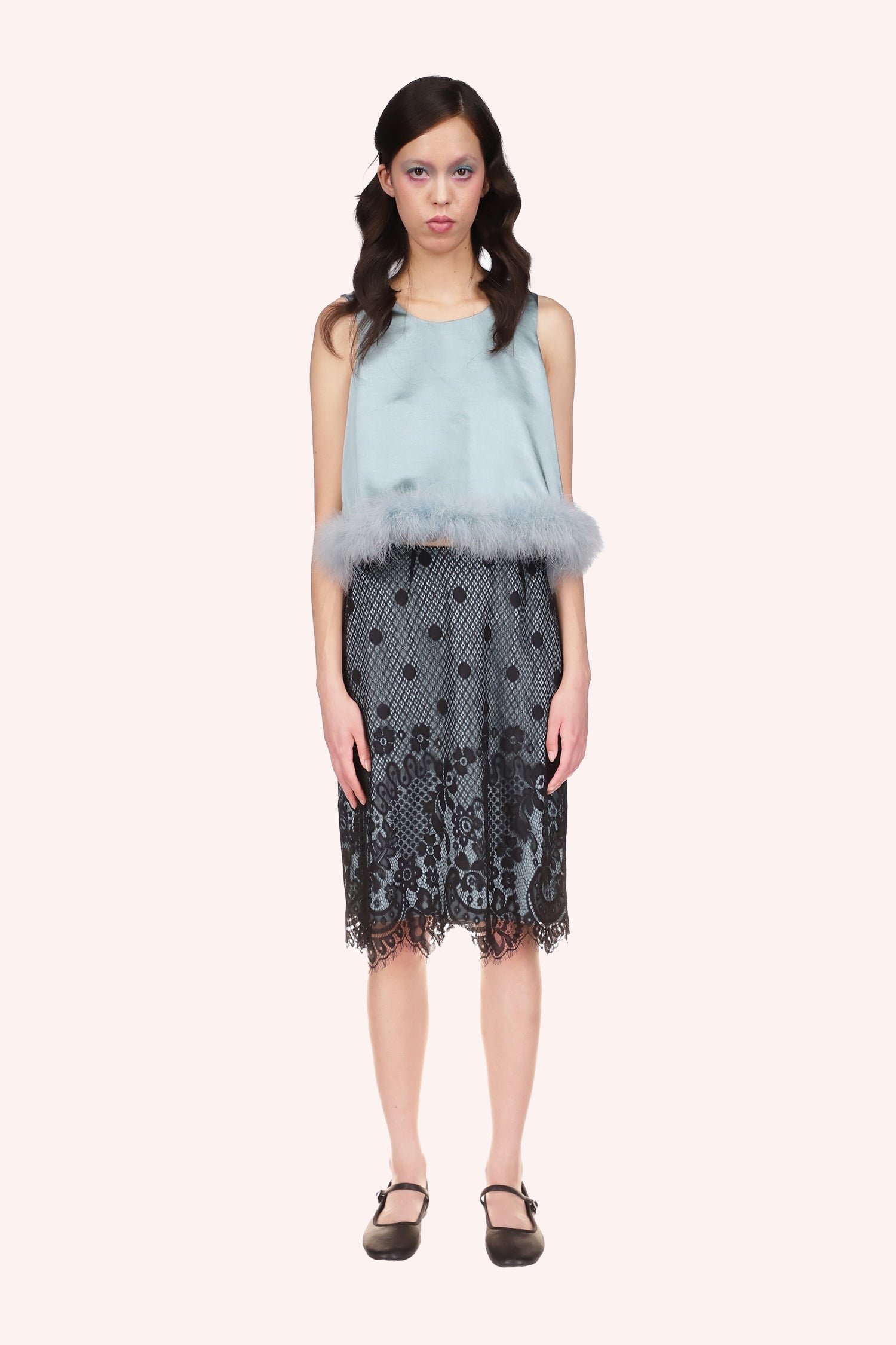 Chic and eye catching, this washed satin with lace top trimmed with marabou feather features a light weight feel and relaxed fit. Its smooth dusty blue satin fabric combined with feathered detailing evokes femininity.