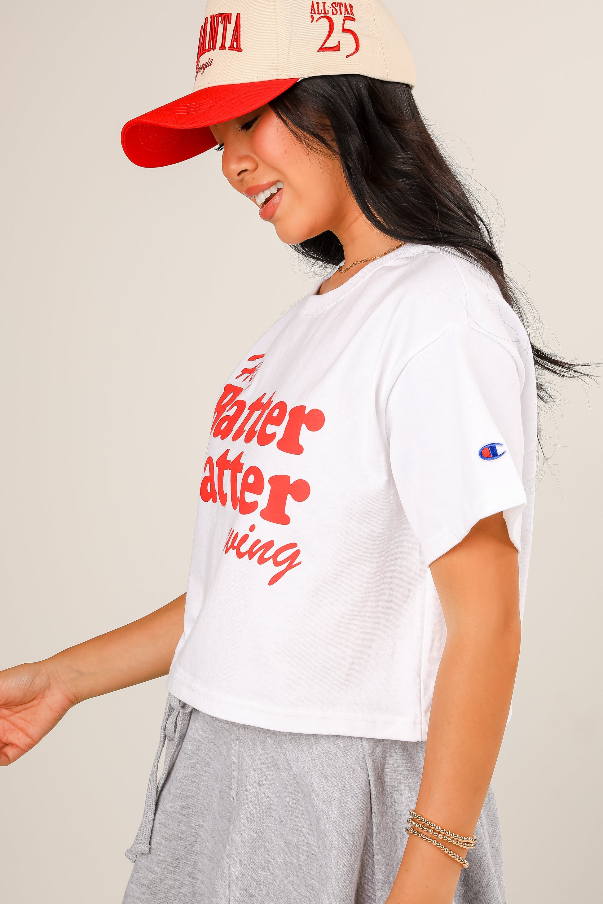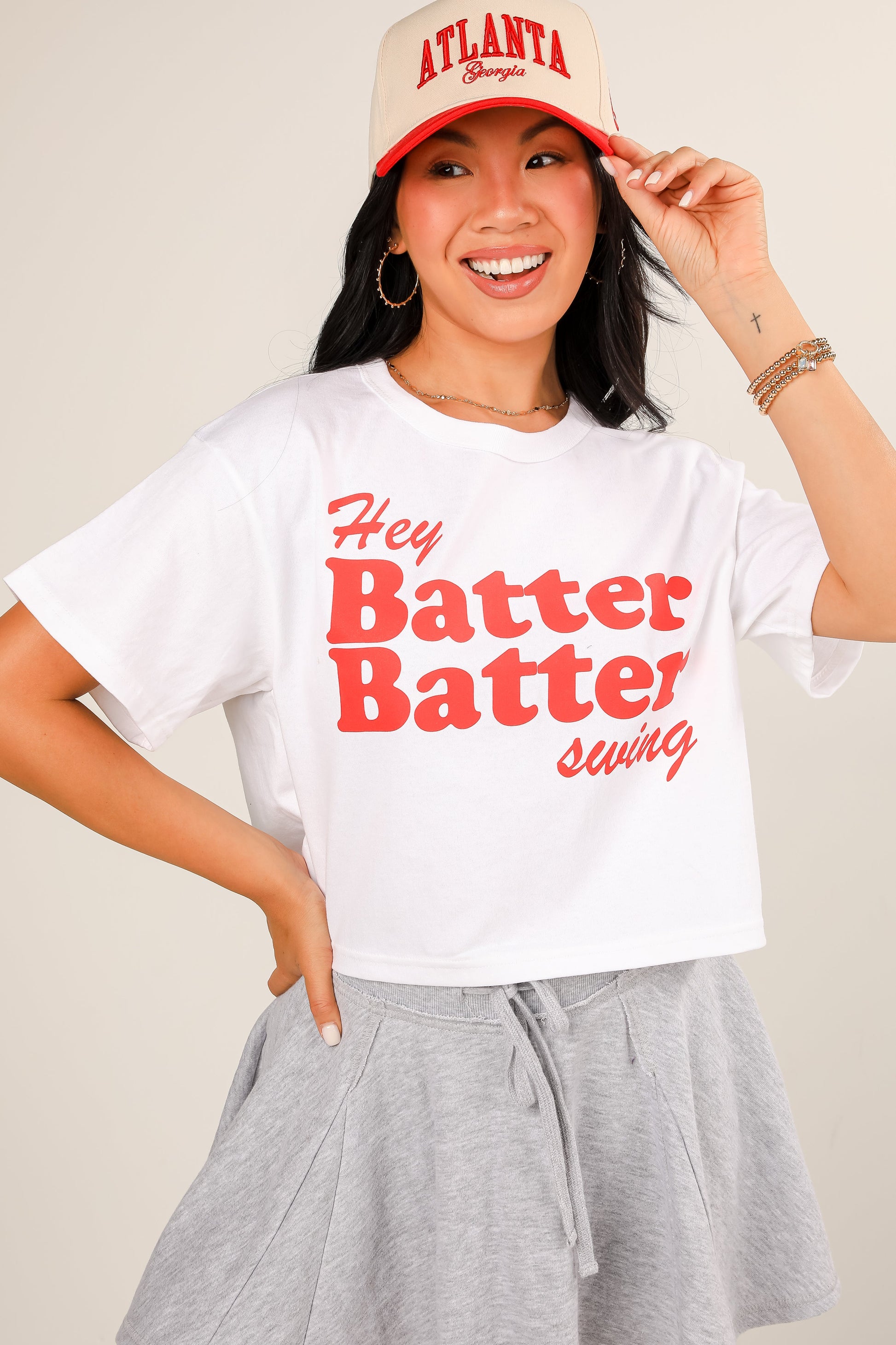 Calling all baseball fans, the White Hey Batter Batter Swing Cropped Tee was made just for you! This comfy tee is designed with a soft and stretchy knit. It features a crew neckline, short sleeves, a relaxed mid-crop fit, and the words Hey Batter Batter Swing on the front. Style the White Hey Batter Batter Swing Cropped Tee with your favorite distressed denim shorts and a baseball hat for the perfect game day look!