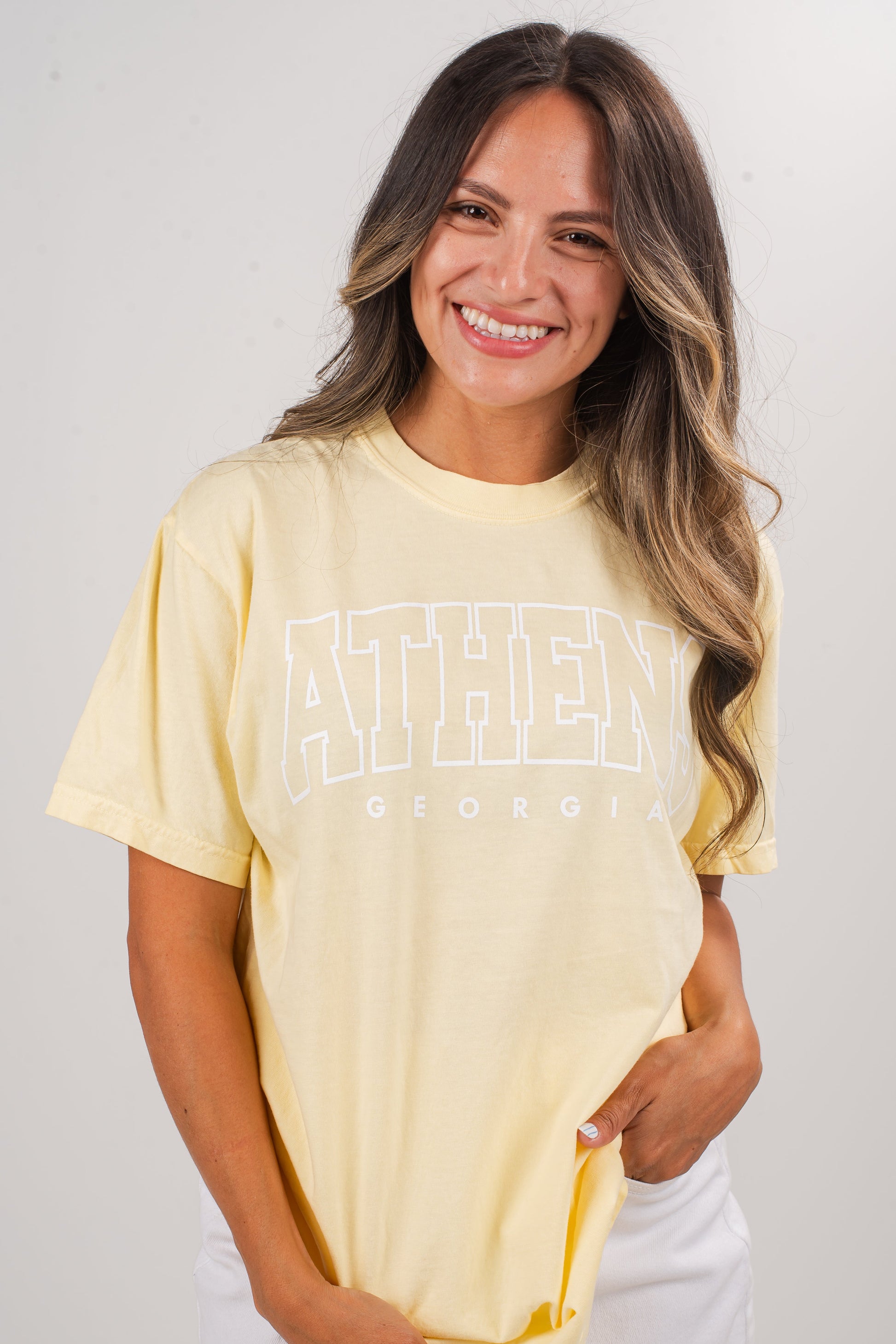 Calling all Athens residents, the Yellow Athens Georgia Tee was made just for you! This comfy tee is designed with a soft and stretchy knit. It features a crew neckline, short sleeves, a relaxed fit, and the words Athens Georgia on the front. Style the Yellow Athens Georgia Tee with your favorite distressed denim and a baseball hat for a game day!